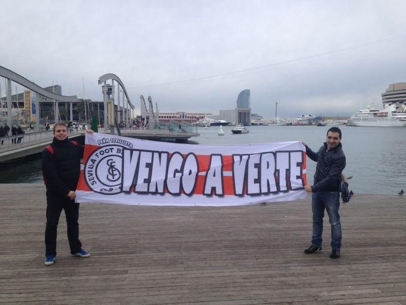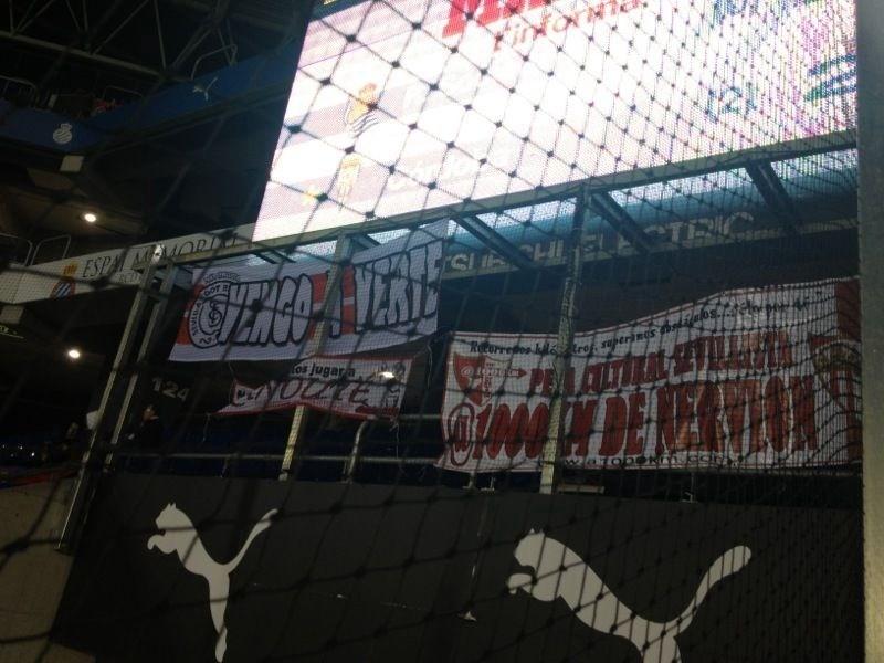 Meritorio viaje de algunos socios de nuestra peña a Cornellá-El Prat para ver a nuestro equipo clasificarse para los Octavos de Final de la Copa del Rey este pasado miércoles. Viaje fugaz que probablemente se repetirá la semana que viene para acompañar también al Sevilla FC en su compromiso liguero en ese mismo estadio que hoy hemos coloreado un poco con nuestra nueva pancarta.